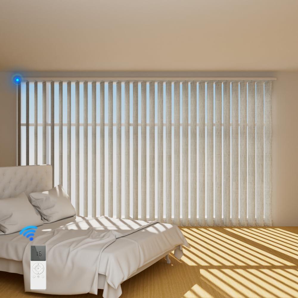 - Premium Material & UV ProtectionOur motorized vertical blinds are crafted from durable 3.54" slat fabric, offering superior UV protection and long-lasting performance. Perfect for sliding glass doors or large windows, these blinds feature tiltable slats that allow you to adjust light and privacy levels effortlessly. Create the perfect ambiance while protecting your home from harmful sun rays.
