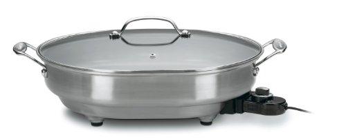The brushed stainless steel Cuisinart Electric Skillet is one of the most versatile countertop cooking appliances on the market and a valuable addition to any kitchen. A temperature probe adjusts from Warm to 450F and can be removed to make the Skillet dishwasher safe. The nonstick cooking surface is ideal for low-fat or no-fat cooking and is big enough for family orders of pancakes, or a fajita with friends.