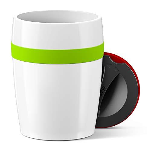 Travel Cup Ceramics: a ceramic cup... clever! Enjoy the taste of your coffee, tea or other drink at home or in the office! Designed in stainless steel with ceramic coating, the Travel Cup Ceramics is stylish and modern with a touch of colour. Its ideal size is suitable for all types of coffee machines (including automatic machines in business). Its ceramic coating on the rim and interior preserves the taste and aroma of your drinks. In addition, its stainless steel construction and anti-spill lid with rotating closure help keep your drinks warm. Its non-slip base is practical, and its high-gloss plastic coating protects your fingers from heat. It is compatible with standard car cup holders. It can also be used as an ice cube! Fully dishwasher safe for easy cleaning and perfect hygiene, the Ceramics Travel Mug is guaranteed for 5 years.