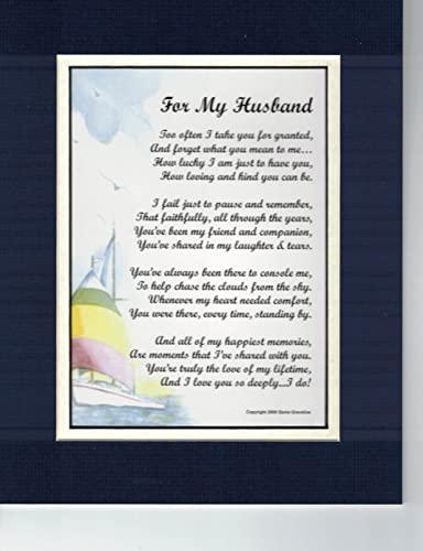This beautiful, heart-stirring verse is the creation of nationally recognized poet, Genie Graveline. This quality 8x10 print is double-matted in navy over white. The Verse is For My Husband Too often I take you for granted And forget what you mean to me How lucky I am just to have you How loving and kind you can be I fail just to pause and remember That faithfully all through the years You've been my friend and companion You've shared in my laughter and tears You've always been there to console me To help chase the clouds from the sky Whenever my heart needed comfort You were there, every time, standing by And all of my happiest memories Are moments that we've shared with you You're truly the love of my lifetime, And I love you so deeply, I do!