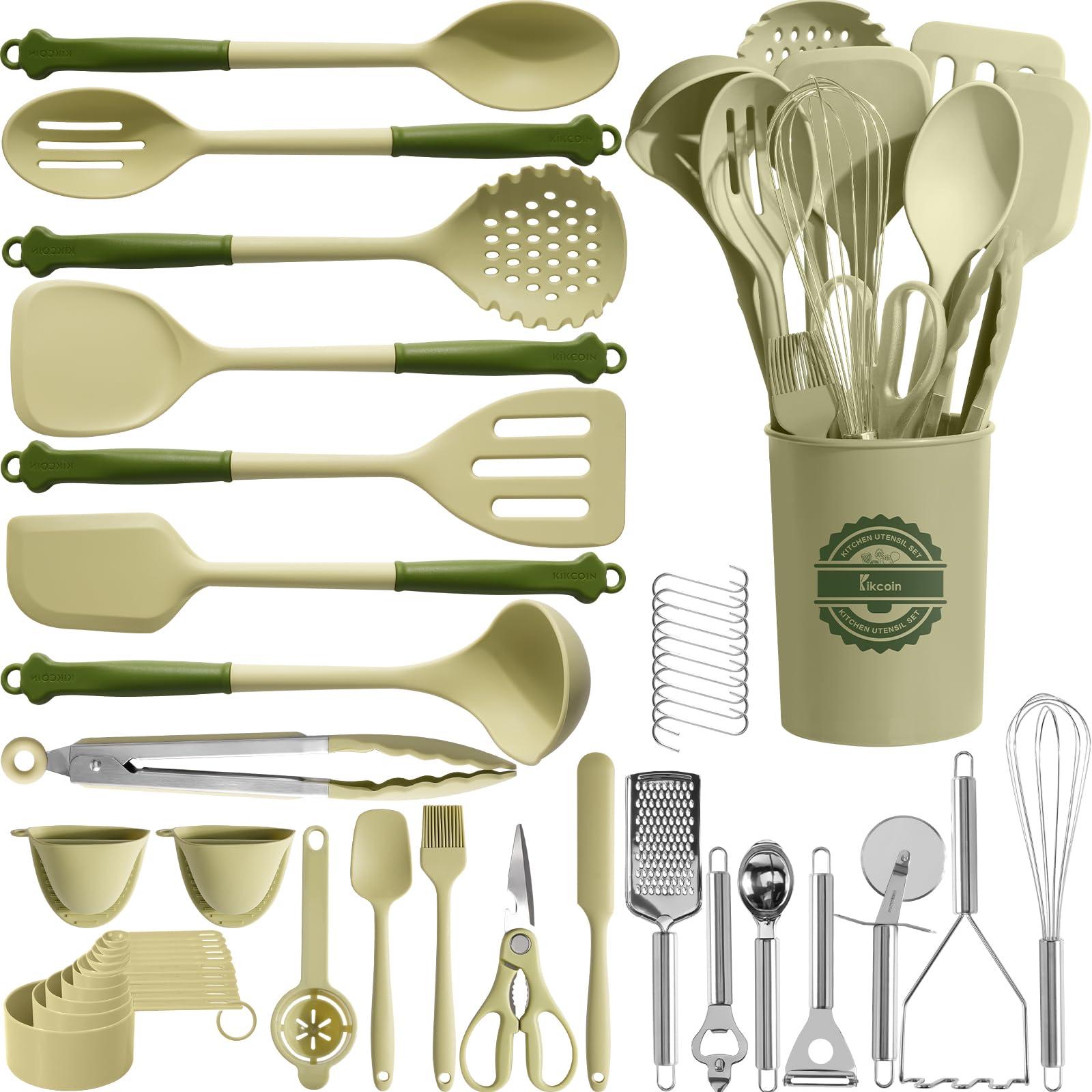 - ESSENTIAL PACK FOR HOME COOKMaybe you're an experienced mom, this kitchen utensil set would be a good choice to upgrade the old ones. Or if you're a beginner starting fresh in a new apartment, this all-inclusive kitchen essentials would match you. It includes solid & slotted turner, soup ladle, serving spoon, slotted spoon, pasta spoon skimmer, large spatula, tongs, whisk, scissors, 6*304 stainless kitchen gadgets, jar spatula, brush, egg separator, measuring cup&spoon set, 2*oven mitts, 10*hooks, utensils holder.
