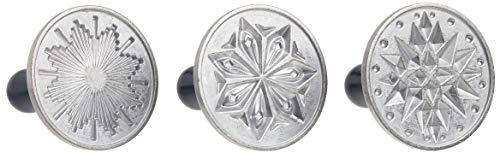 Nordic Ware Starry Night Cookie Stamps feature dazzling stars that imprint onto your cookie dough, creating a beautiful design that makes your baked goods stand out. These silver cast cookie stamps with midnight blue wooden handles are perfect for adding a unique touch to your cookies. The set includes three unique 3-inch round dazzling star designs. Press the stamp into your cookie dough before baking to create imprints that will make your treats stand out! We suggest making cookie dough from scratch when using cookie stamps. Cookie stamp impressions will not be as defined if using prepackaged cookie mixes or refrigerated dough. Apply a light coat of oil to each stamp using a pastry brush or nonstick spray. Reapply oil if cookie dough begins to stick to stamp. Imprints work best when you refrigerate covered dough in plastic for at least 2 hours or up to a day. Hand wash only and never submerge wooden handles in water. Wipe clean. Proudly American Made since 1946.