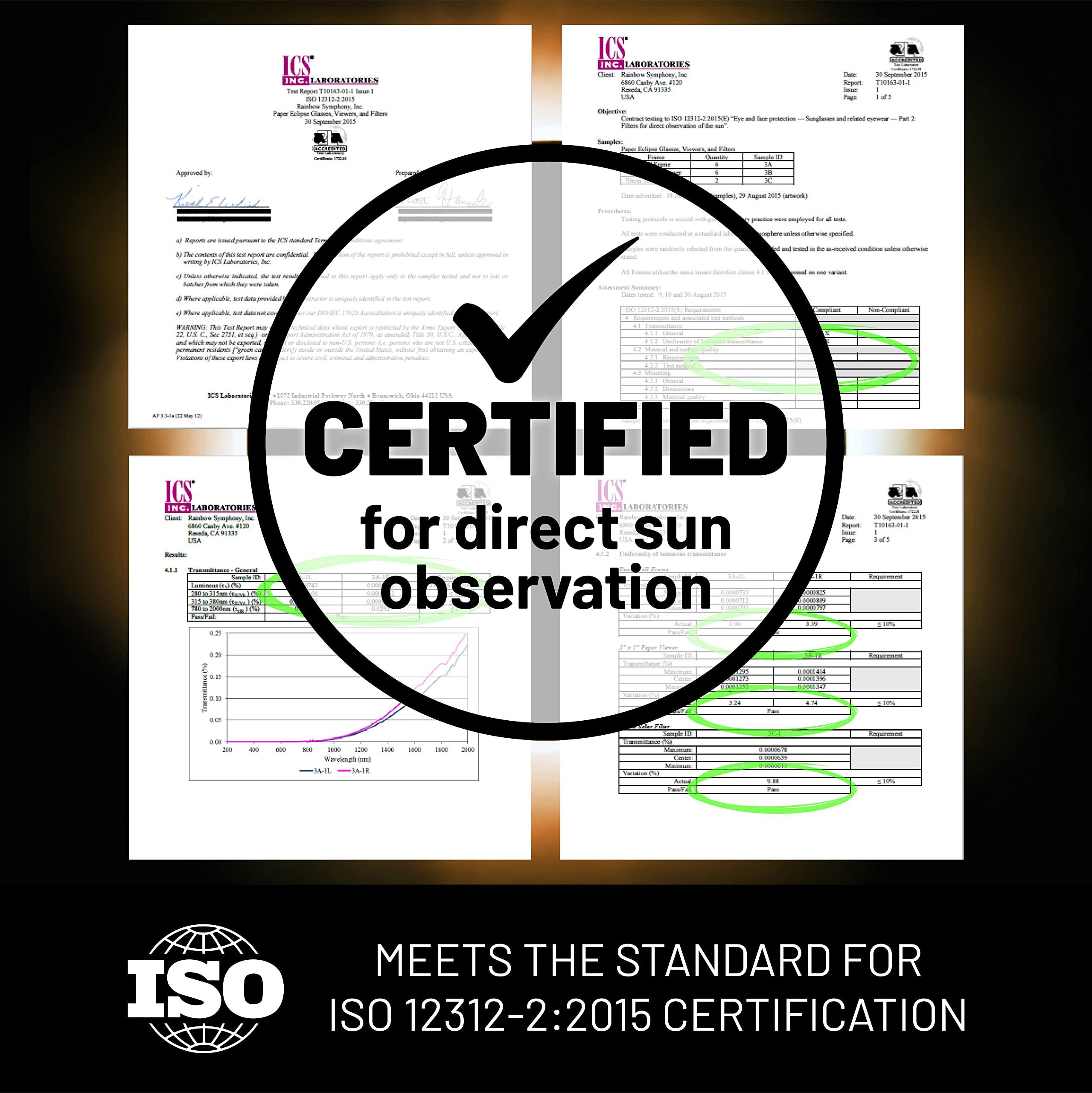 • CE & ISO CERTIFIED: Our eclipse glasses are CE and ISO certified and feature an optical density of five or greater to filter out 100% of harmful ultra-violet, 100% of harmful infrared, and 99.999% of intense visible light, making it safe for direct solar viewing.