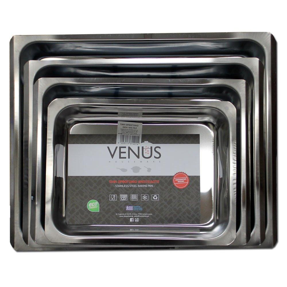 Venus Set of 4 Rectangular Stainless Steel Cooking Pans -- Tapsia Pans -- 18/10 Steel The Greek baking pan known as "tapsi" is an important element in Greek cooking. This set of four stainless steel baking pans are made and imported from Greece. Perfect for baking your pastichio, mousaka, baklava, or any other Greek recipe calling for a rectangular deep baking pan. These versatile pans are suitable for stove tops and oven baking. These pans are made of 18/10 Steel which is a high quality steel that lasts longer and cooks food more efficiently. 18/10 stainless steel is made of 18% chromium and 10% nickel, which will keep its silver-like shine longer than 18C-340 steel will. 18/10 stainless steel is commonly used in flatware. 18/10 Stainless Steel Made in Greece Pan Number width x length x depth #2 25 x 34 x 6 cm (9.8 x 13.4 x 2.3 inches) #3 29 x 39 x 6.5 cm (11.4 x 15.3 x 2.5 inches) #4 33 x 43 x 6.5 cm (13 x 17 x 2.5 inches) #5 38 x 47 x 6.5 cm (14.9 x 18.50 x 2.5 inches)